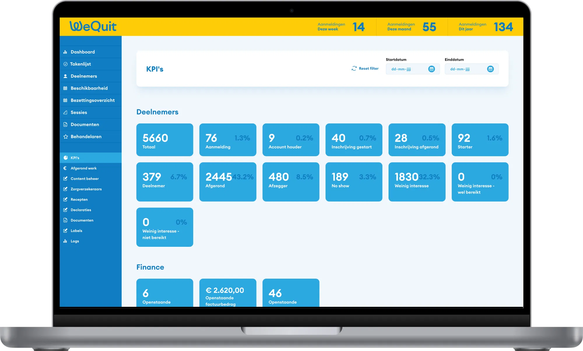 Om de flow door het systeem zo optimaal mogelijk te maken, zijn er uitgebreide KPI's beschikbaar voor de WeQuit beheerders. Zo is bijvoorbeeld te zien welk percentage van de deelnemers het hele traject helemaal zelf doorloopt, of bij welke intake stappen de meeste vertraging ontstaat. Dankzij deze KPI's kan het systeem continu verbeterd worden voor een zo goed mogelijke gebruikerservaring.